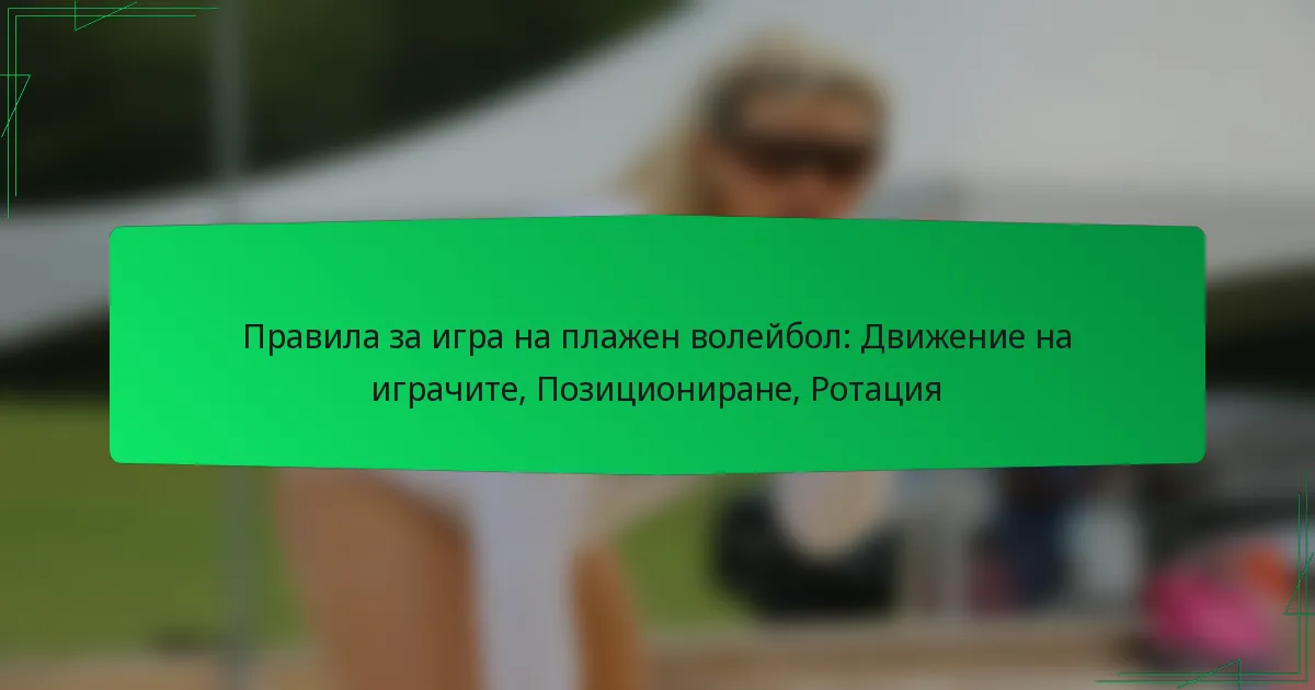 Играта на плажен волейбол се управлява от специфични правила, които определят движението на играчите, позиционирането и ротацията, за да се осигури честна игра и да се поддържа динамиката на играта. Играчите трябва стратегически да се позиционират на игрището, раз understanding своите роли и динамиката на екипната работа, за да оптимизират както атакуващите, така и защитните действия. Освен това, системата за ротация изисква играчите да сменят позициите си след спечелване на сервиз, което им позволява да изпитат различни роли през мача.